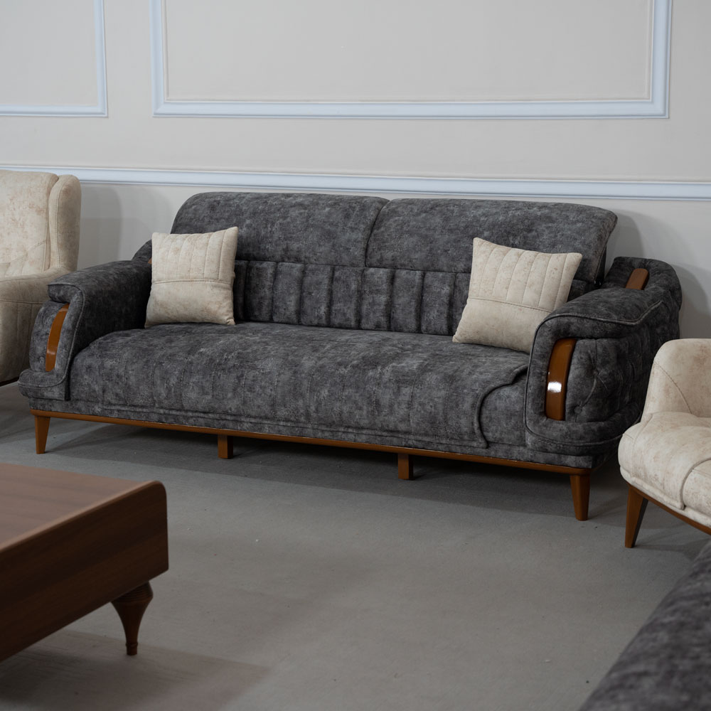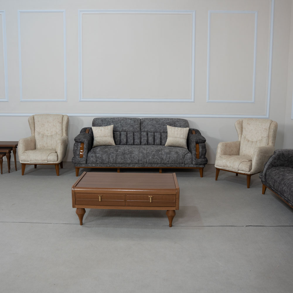 مبل لارسن یک مبل راحتی ۸ نفره مدرن شامل دو کاناپه سهنفره و دو تکنفره است که با ترکیب رنگ طوسی تیره و کرم روشن طراحی شده. کلاف ترکیب چوب نراد و سنوبر، چوب نمای راش و توسکا، اسفنج ۱۲ سانتی ۳۰ کیلویی ویژه و پایه مخفی، این مدل را به گزینهای بادوام و شیک برای پذیرایی مدرن تبدیل کرده است.