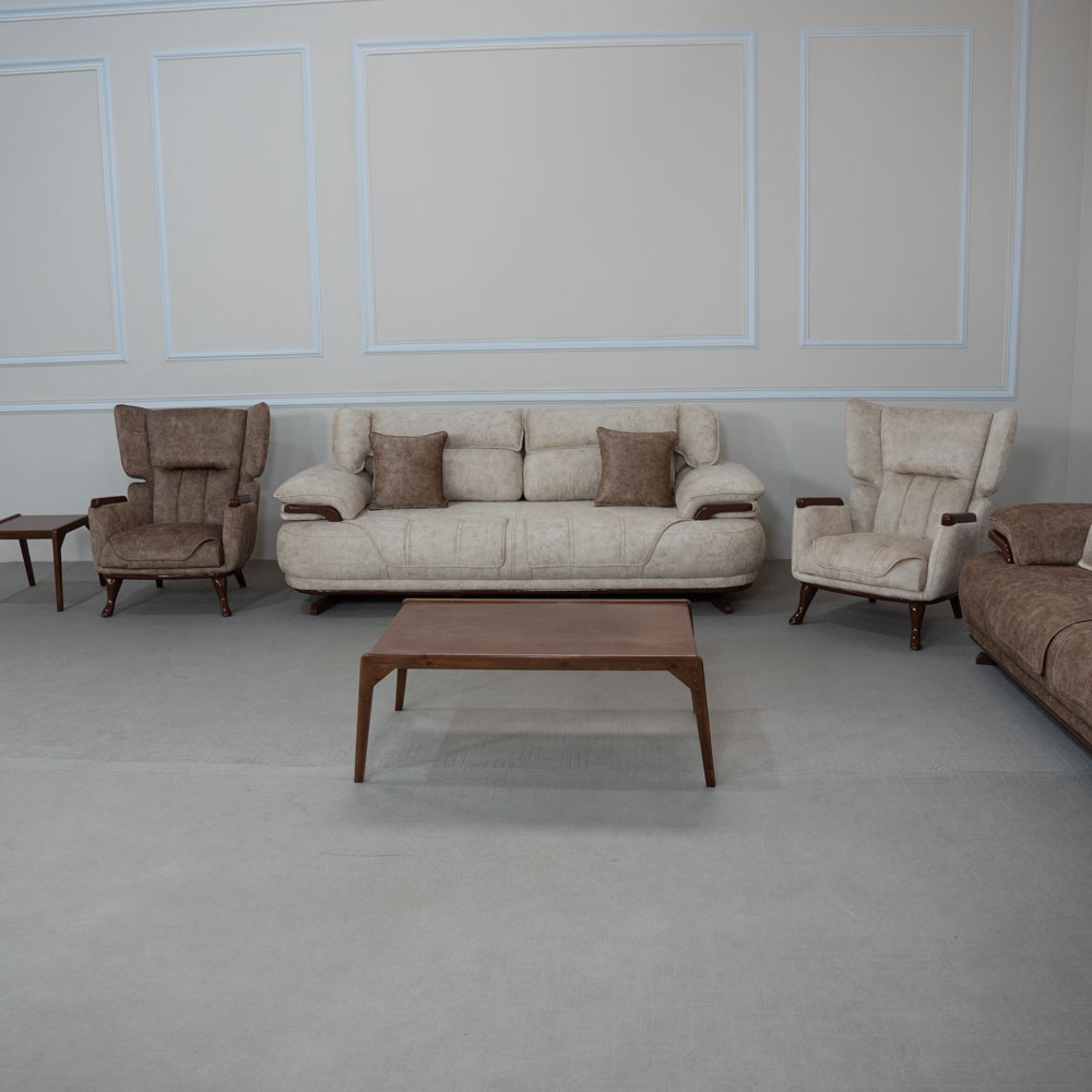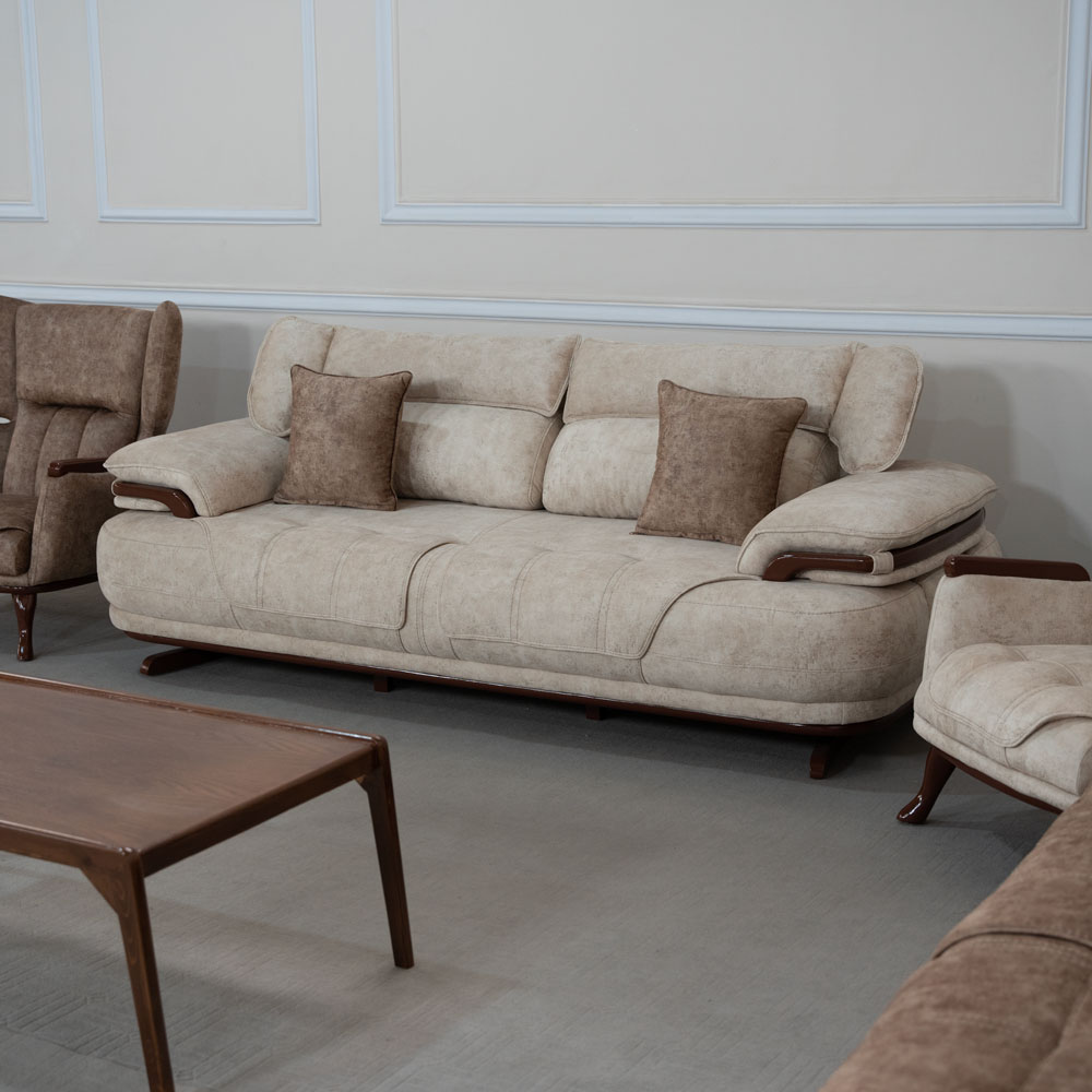 مبل کینگ با پارچه لویویتون باکیفیت طراحی شده است تا هم زیبایی و هم راحتی را به فضای خانه شما بیاورد. این ست شامل یک کاناپه تک نفره کرم روشن و یک کاناپه تک نفره نسکافهای است که با رنگبندی هماهنگ، جلوهای مدرن و لوکس به اتاق شما میدهد.
